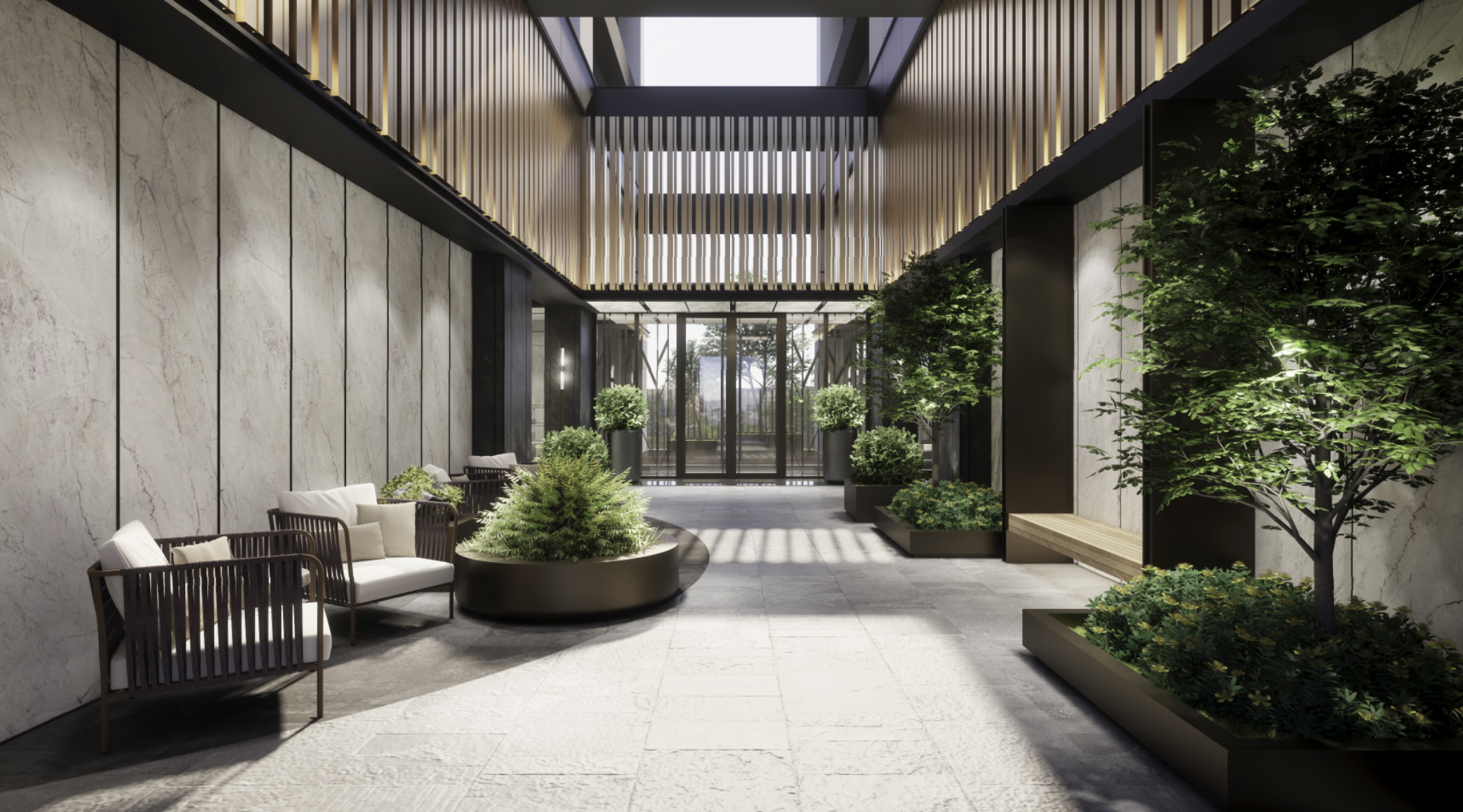 進入挑高4米2門廳,陽光順勢灑落,一眼觸及宜人的景觀廊道,在中庭藝廊裡安靜自處,兩區公設規劃動靜兼俱,健身房,媽媽教室、交誼閱覽空間…好公設不在奢華,而是放下手中3C享受空間3D,享受生活當下。