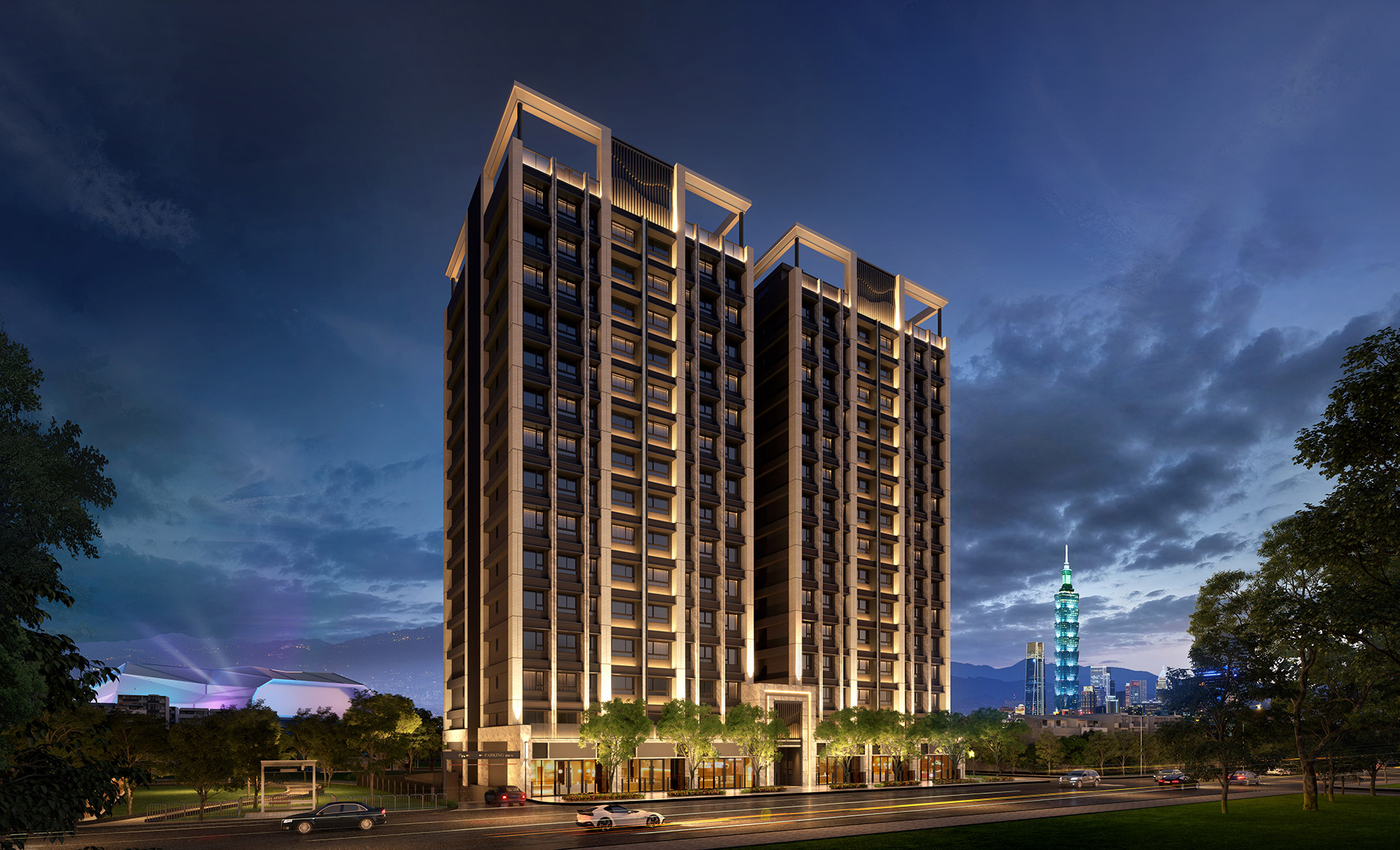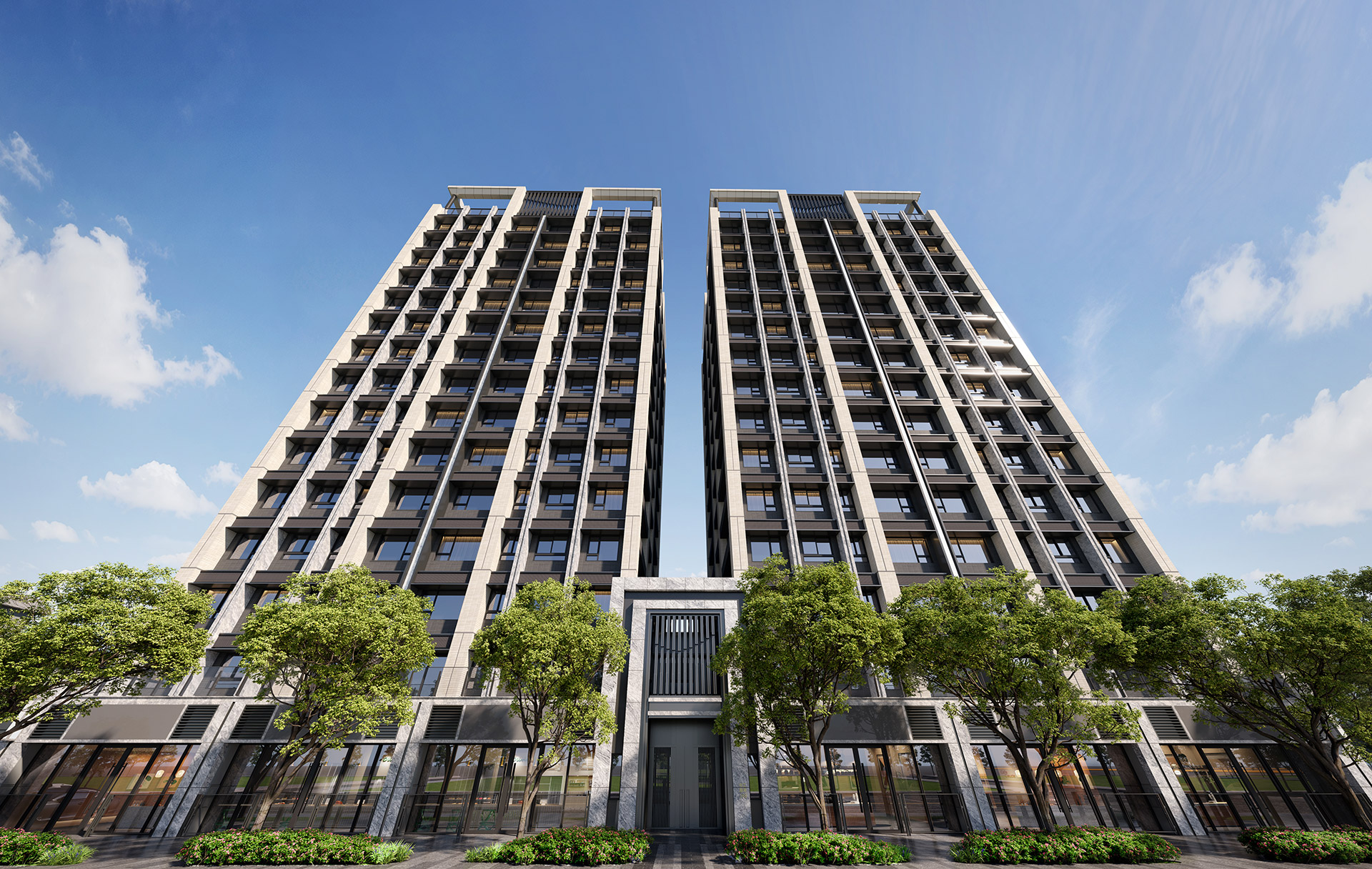 簡潔當代的輕盈量體、創造出接軌國際建築的外觀,在近670坪的⽅正⼟地上,兩棟式建築,以古典對稱美學向鄰⾥問安,垂直俐落的向上線條、深入淺出的層次,呼應南港的再⽣,與扶搖直上的未來。